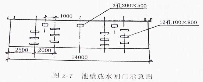 進(jìn)灰水渠道斷面為50cm×70cm,總長200m。池壁放水閘門(圖2-7)由標(biāo)高0.3m開始,每隔0.2m設(shè)兩個(gè)0.1m×0.8m的排水孔,及標(biāo)高0.5m、0.7m、0.9m、1.1m和1.3m處各設(shè)兩個(gè)。標(biāo)高1.5m處設(shè)三個(gè)0.2m×0.5m的排水孔。排水管道190m,井點(diǎn)抽水設(shè)備兩套。