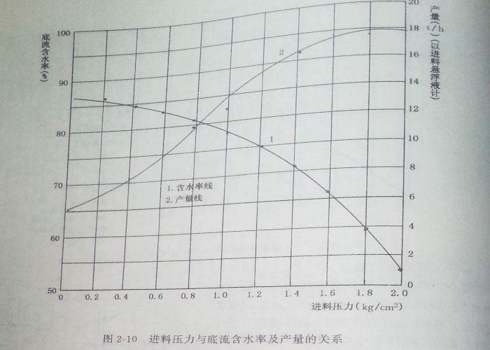 試驗(yàn)表明,進(jìn)料壓力對(duì)底流濃度影響很大,詳見圖2—10。進(jìn)料壓力越高,底流含水率越低。當(dāng)進(jìn)料壓力達(dá)到182~203kpa(1.8~2個(gè)標(biāo)志大氣壓)時(shí),含水率降到52%~60%既達(dá)到能在管道中流動(dòng)的極限值。進(jìn)料壓力對(duì)產(chǎn)量也有直接影響,隨著壓力的提高,產(chǎn)量也增加,當(dāng)壓力超過162kpa(1.6個(gè)標(biāo)準(zhǔn)大氣壓)后,產(chǎn)量曲線漸趨平緩。進(jìn)料壓力與溢流中的固體含量關(guān)系不大,不論壓力多大,溢流中的固體含量均為2.2%~3.1%。