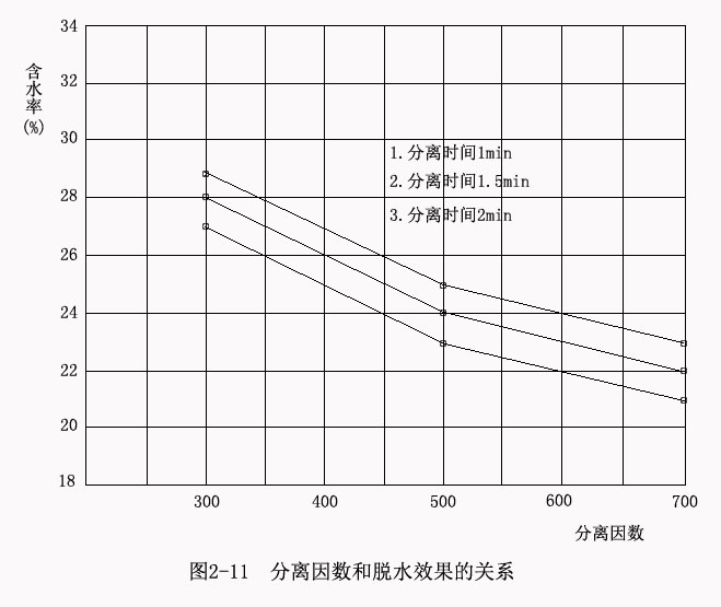 分離因數(shù)愈大,離心分離過程進(jìn)行得愈加強(qiáng)烈。試驗(yàn)證明,隨著分離因數(shù)的提高,粉煤灰含水率逐漸降低,但濾餅密度并未提高,也就是說,物料并不因分離因數(shù)的提高而被壓縮,可見,提高分離因數(shù)是降低粉煤灰含水率的有效措施。試驗(yàn)結(jié)果見表2-4和圖2-11。