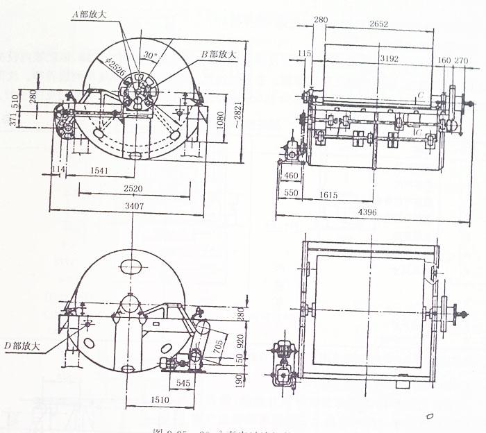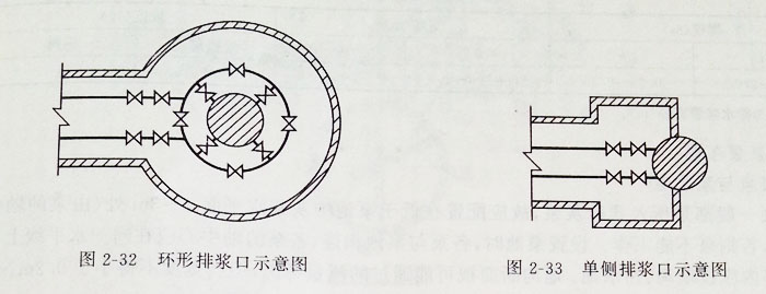 濃縮機(jī)底部排出漿口合適位有四個(gè),最少應(yīng)有兩個(gè)。其布置形式有環(huán)形(圖2-32)和單側(cè)式(2-33)兩種,前者排漿較均勻,但閘門較多,后者排漿不夠均勻,但閘門較少。