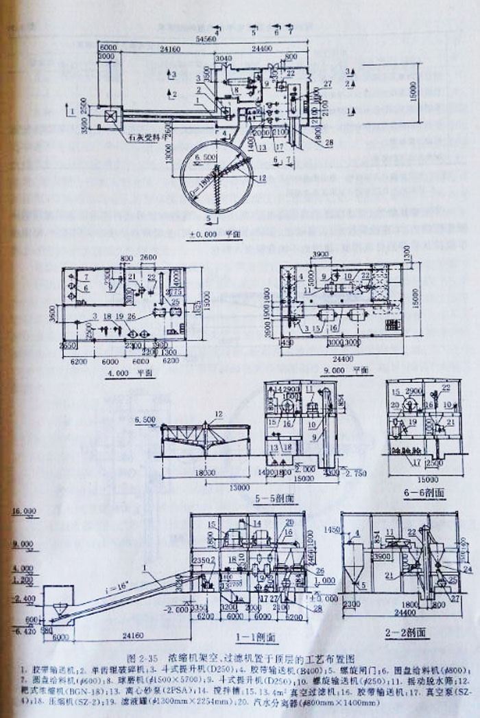 ②濃縮機(jī)臥地,過濾機(jī)置于底層的布置,見圖2—36.。這種布置形式將脫水設(shè)單獨(dú)設(shè)在一幢建筑內(nèi),土建材投資小設(shè)備就位、安裝、檢修都很方便。主要缺點(diǎn)是很難實(shí)現(xiàn)濾液、溢流和事故排灰漿等的自流排放,濾餅也不能直接進(jìn)入料倉。